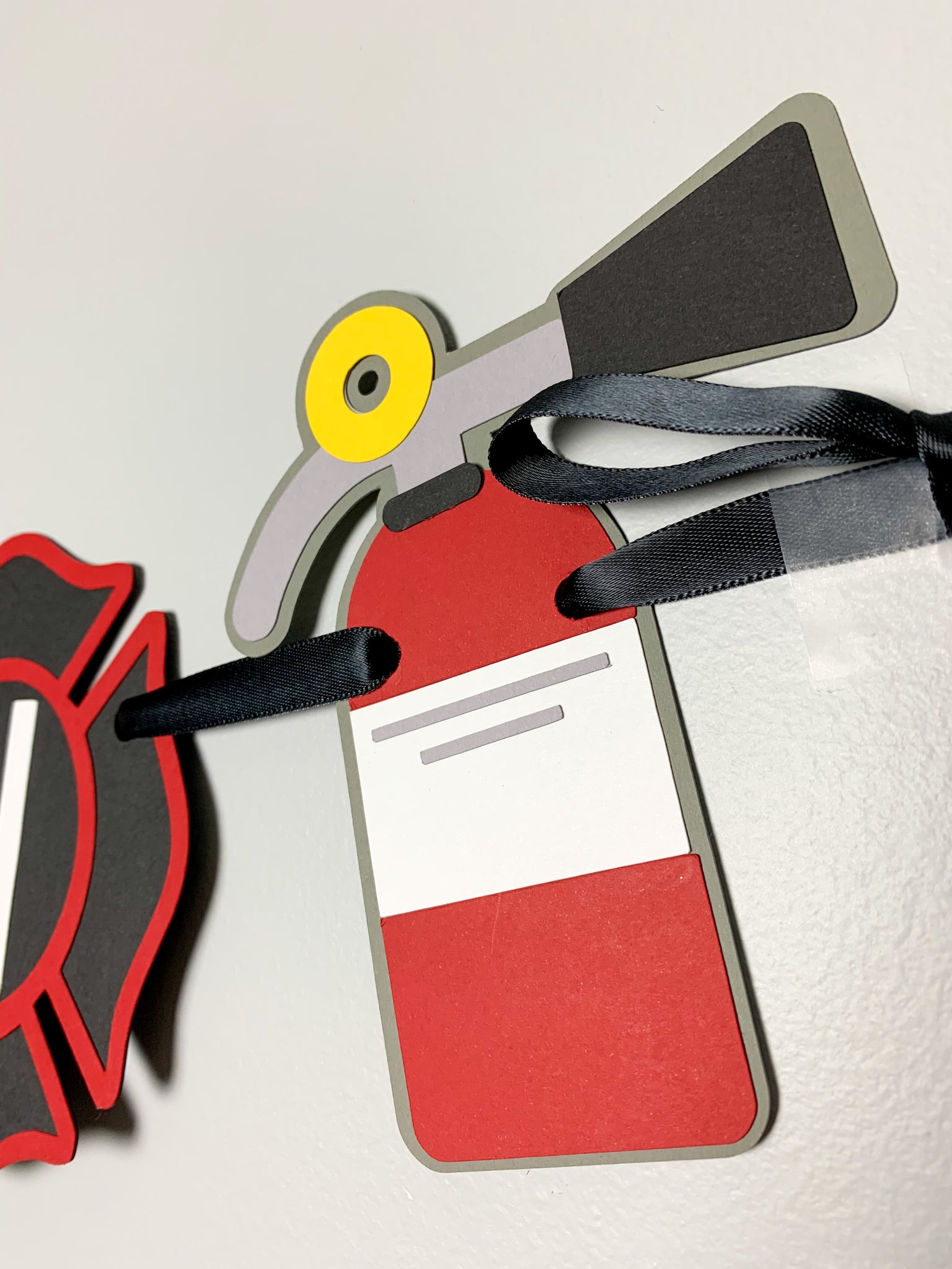 Each pennant is cut to be the shape of a fireman badge. The base of each badge is cut from 80# black cardstock and is 5" wide and tall.