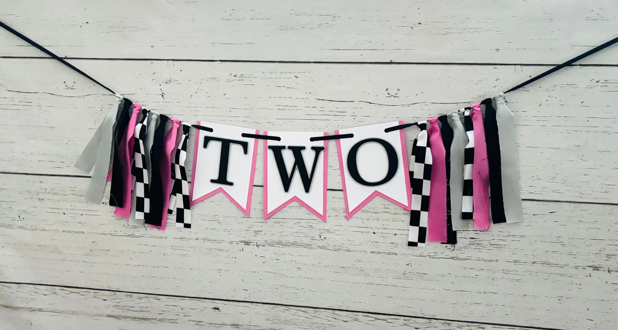 This pink, grey, white and black girl race car themed custom phase banner will be the perfect addition to your little one's birthday!