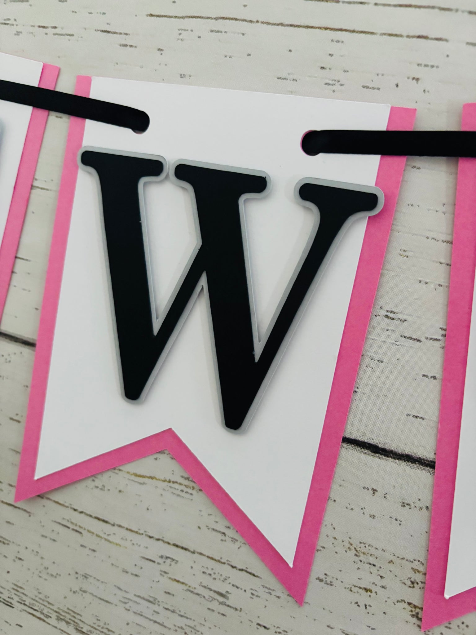 Each pennant is 4x6. The banner is strung on pink satin ribbon. All letters will be upper case.