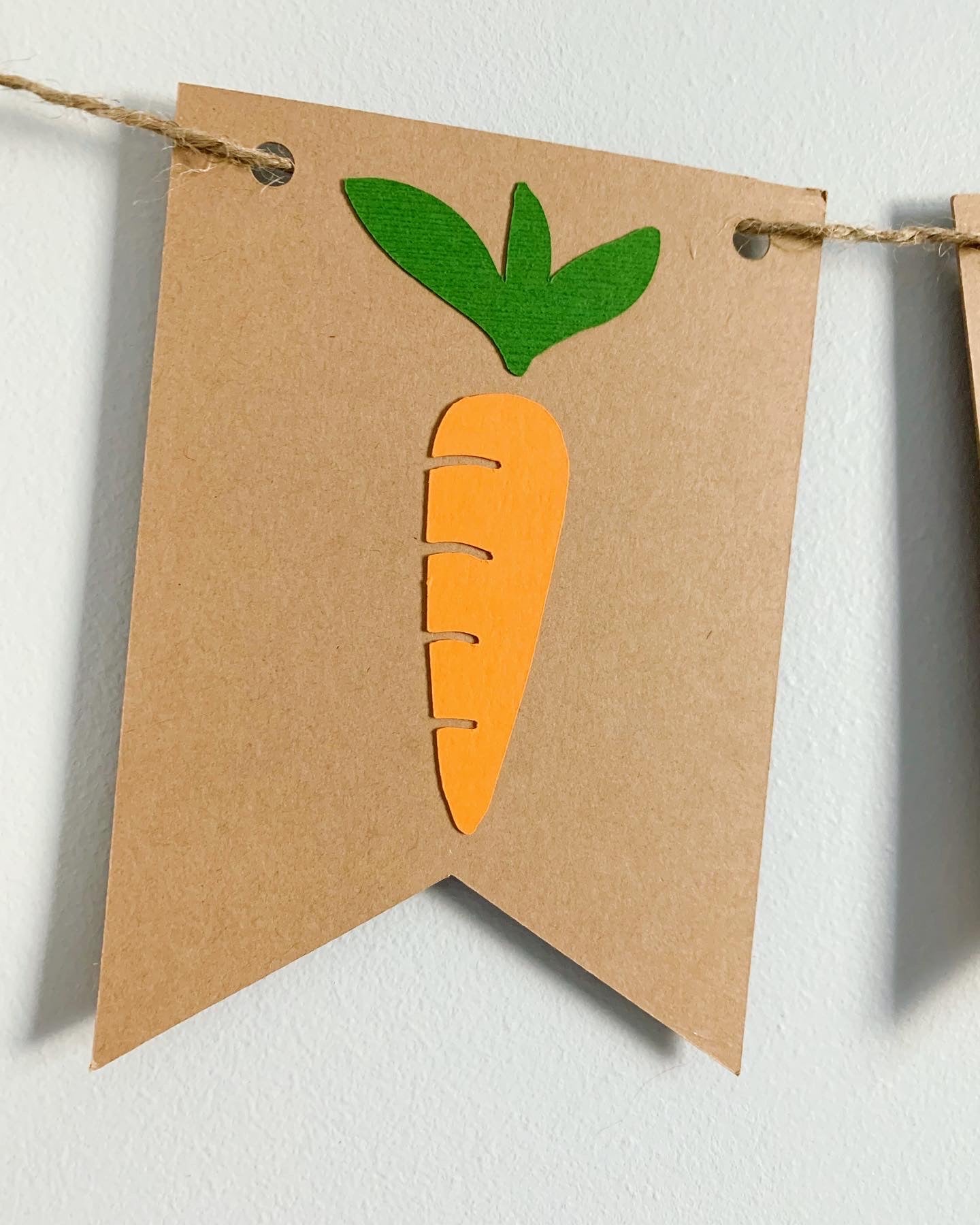 This listing is for an Easter banner. The banner features white bunnies and carrots on kraft brown cardstock.