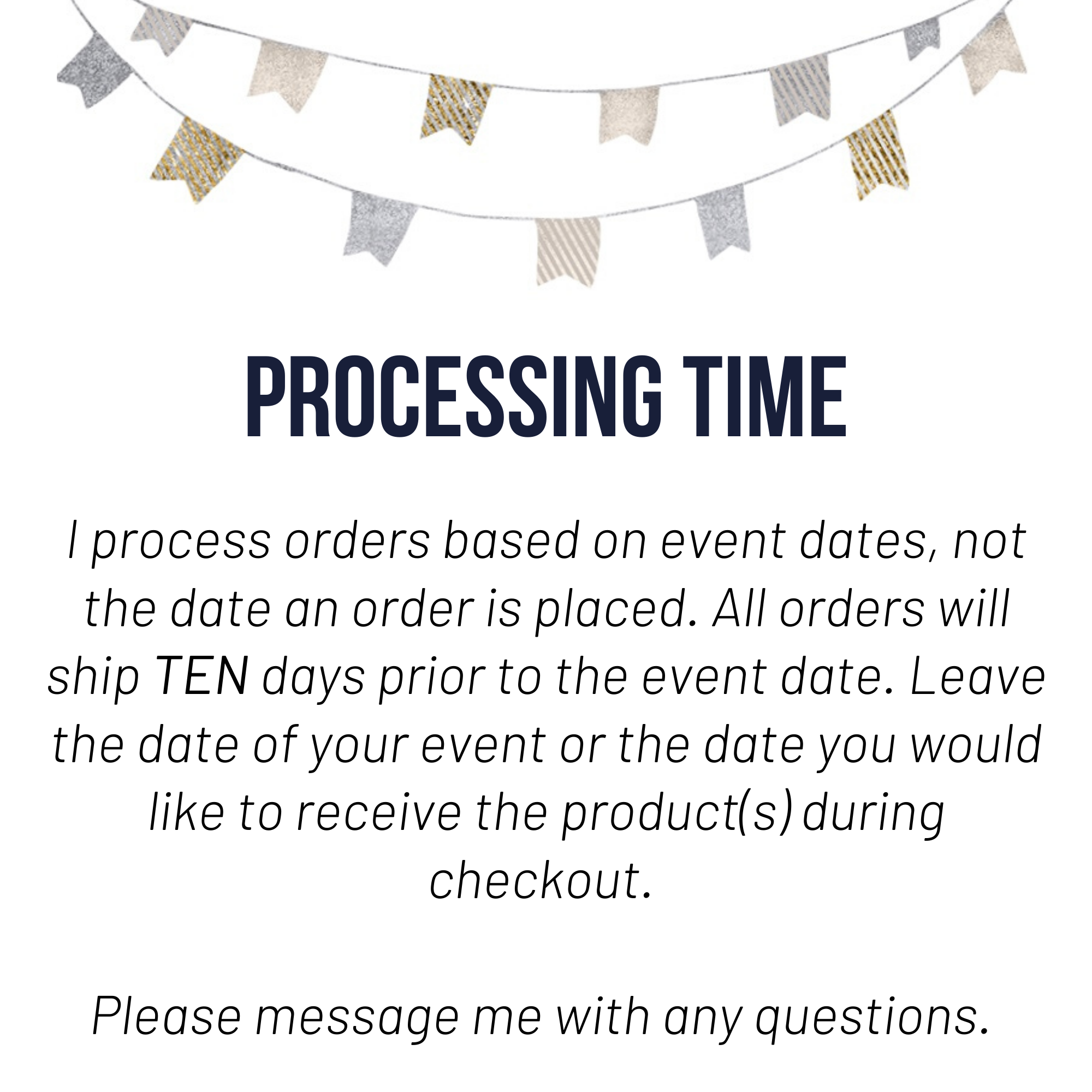 ---> I accept a limited number of orders per week. All orders will ship 10 days prior to the event date.