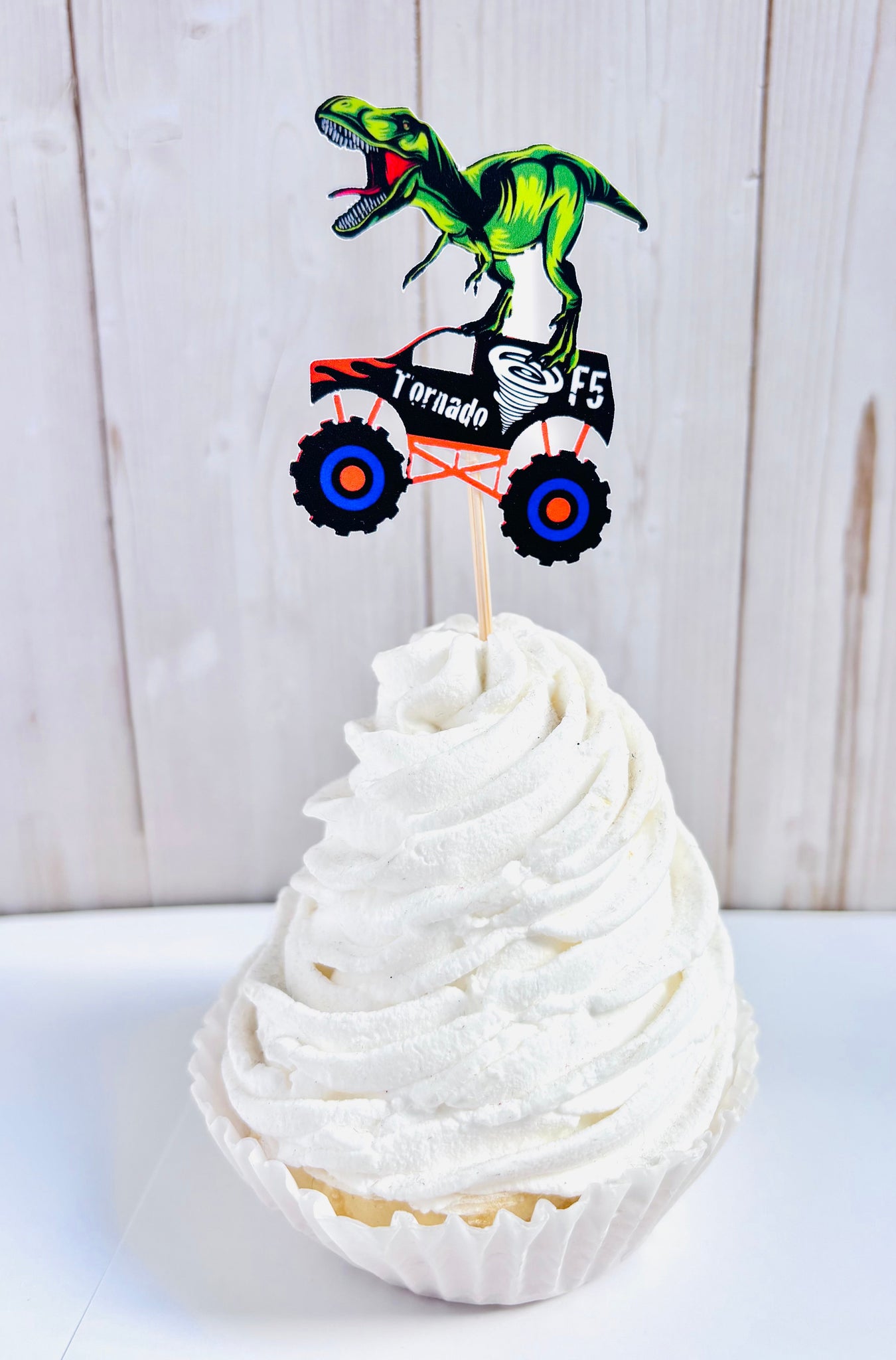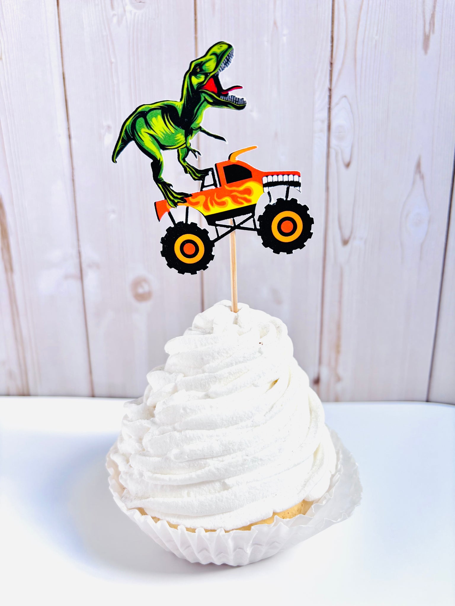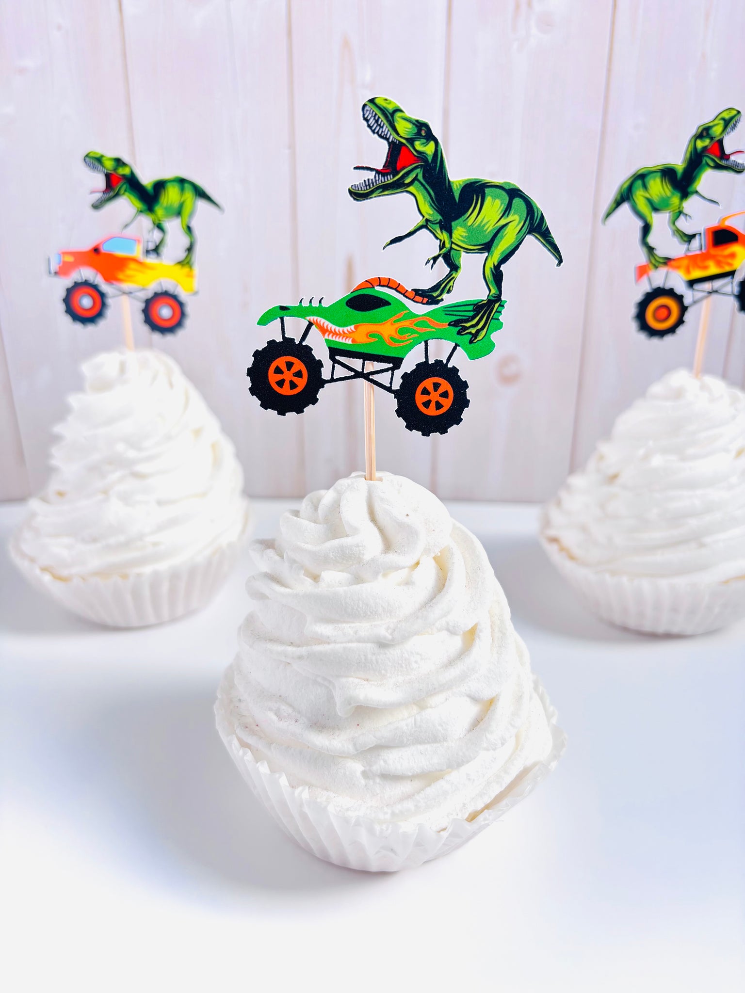 This listing is for a set of dinosaur T-Rex monster truck cupcake toppers.